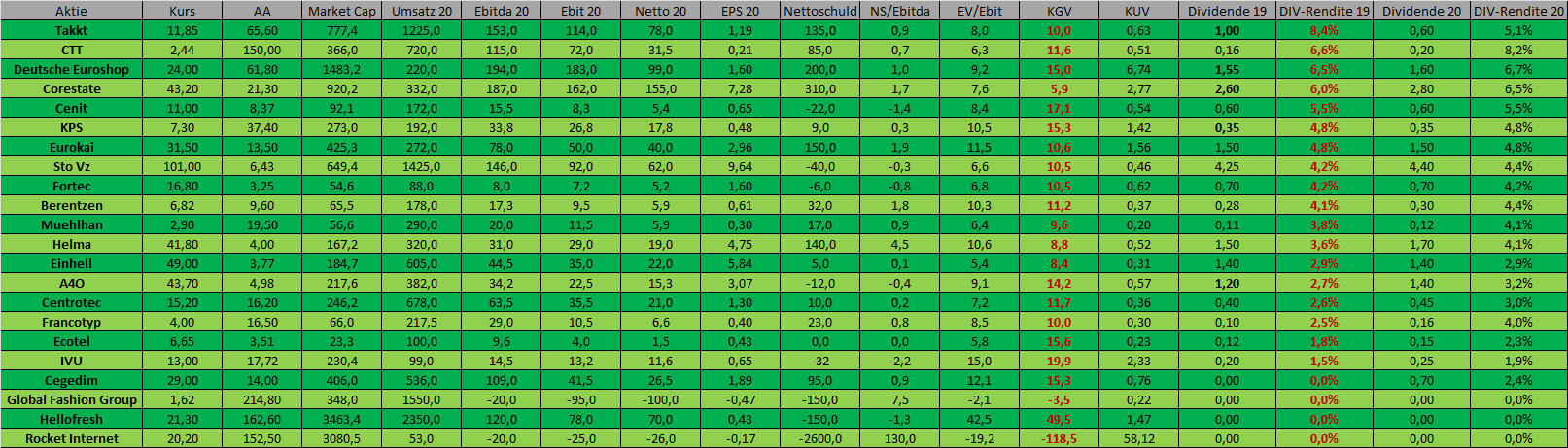 Relativ sicher dprften die Dividenden bei den der Deutschen Euroshop sein, die kürzlich diese Dividende bestätigte und seit 10 Jahren immer die Dividende leicht erhöhte. Auch bei CTT, Office Depot, KPS, Sto, Helma und Berentzen seh ich da wenig Gefahren, auch was die Dividende für 2020 betrifft, die dann 2021 gezahlt wird. Eine Besonderheit könnte Francotyp bilden, weil ich dort davon ausgehe, dass der Überschuss in diesem Jahr stark steigt und damit auch die Dividende auf mindestens 16 Cents fürs laufende Jahr. Insofern wird diese Aktie dann auch ein echter Dividendenwert mit Rendite von 4,5%. Insgesamt sollte man sich aber immer das Zusammenspiel von Dividende, Gewinnnachhaltigkeit, Wachstumsperspektive und Gewinn/Cashflow-Multiplen sein. Eine KPS hat zudem zwar ein etwas höheres KGV als die anderen Werte, aber eine sehr gute Bilanz- und Cashflow-Qualität, so dass selbst da die Dividende mindestens konstant gehalten werden dürfte, falls das Wachstum nicht so mit knapp 6% p.a. eintritt wie ich es erwarte.