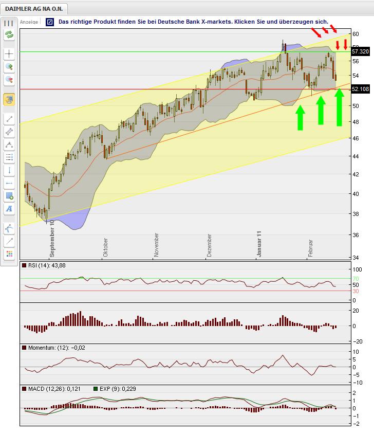 Das spiegelt sich bereits im Chart von Daimler wieder, denn ein Großteil der Verluste wurden bereits wieder aufgeholt. Momentan steht das Papier bei etwas über 57euro. Spannend wird hier, was der Geschäftsbericht 2010, der am 2. März 2011 vorgelegt wird bringt. Wir erwarten durchweg positive Zahlen und wir sehen noch Luft bis zu den Kursständen von ca. 74euro aus dem Jahr 2008.