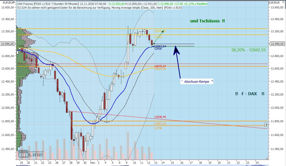 Dax short in bei ca. 13.057 -- ich weiß, nich wirklich prickelnd, der Einstieg, aber voraussichtl. hilft es beim Warten auf den Long-Einstieg 'irgendwo da unten' ;-)) mal gucken, was passiert :-)) -- Mein Bund ist plöderweise leicht im MInus; Luja - da will ich gleich mal schaun/ darf eigentlich ned, tzt !! ;-)) Aber kaum ist halt der Herr aus dem Haus, tanzen die Mäuse auf dem Tisch: btw, hallo, zurück vom Einkauf mit einem mariginalen Umweg 3h durch Wald & Wiesen - genial !