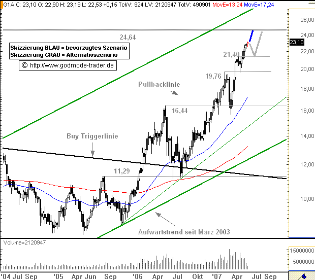 Kurz-Kommentierung: Die GEA Aktie befindet sich in einer langfristigen Aufwärtsbewegung. Mit dem Ausbruch über eine wichtige BUY - Triggerlinie im Januar 2006 auf einem Niveau von 12,10 Euro wurde ein langfristiges Kaufsignal generiert. Ziel ist 24,64 Euro. Diesem Ziel nähert sich die Aktie seitdem unter teilweise nicht unbedeutenden Schwankungen an. Aktuell notiert die Aktie bei 23,10 Euro. Damit fehlt also nur noch ein kleines Stückchen auf dem Weg zu diesem Ziel. Eigentlich sollte die Aktie dieses Ziel nun direkt anstreben. Alternativ streut die Aktie noch eine Rücksetzer bis ca. 21,40 Euro an, wo sich aber dann noch einmal eine interessant Tradingchance ergeben würde