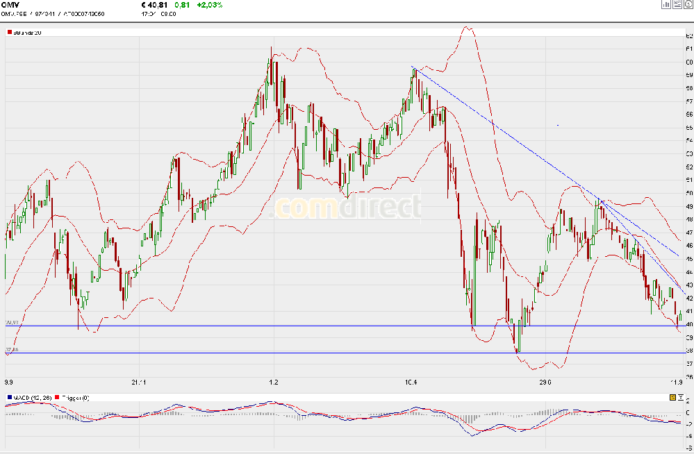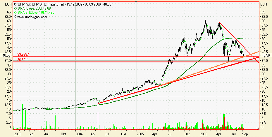 | Darf ich auch noch meinen Senf dazu geben? Irgendeiner nein gesagt? Nein, dann stimme ich a.z. in vollem Umfang zu. Es ist für mich sogar noch etwas schlimmer. Die 40 Euro dürften sehr schnell fallen und erst bei 36,80 sehe ich den Widerstand. Wenn es jetzt ganz dumm kommt, warum auch immer, dann ist sogar dieser Bereich in Gefahr. Aber noch stimme ich einer Trendwende bei 40 Euro zu. Die Linie des up trends kann man auch durch das low vom 14.06 legen (orange linie), dann ergibt sich ein positiveres Bild. Aber ob das dann auch so eintrifft, wage ich zu bezweifeln. Also erst mal schauen, in welche Richtung sich das ganze entwickelt. Wie a.z. schon gesagt hat, lieber keinen Gewinn, als einen Verlust realisiert. Meinen DB555E werde ich schon noch kriegen. Gruß Lea |