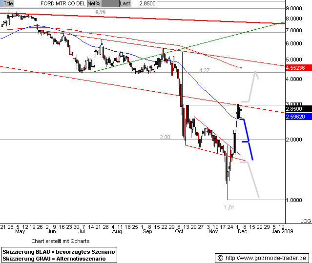 04.12.2008 - 15:30 FORD - War es das nun mit den Höhenflug? Ford - Kürzel: F - ISIN: US3453708600 Börse: NYSE in USD / Kursstand: 2,85 $ Die Ford Aktie vollzog in den letzten Tagen eine massive Kurserholung auf den Kurseinbruch der letzten Monate und verdreifachte ihren Wert von 1,01 $ auf 3,00 $. Bei 2,98 - 3,00 $ trifft die Aktie jetzt auf markanten Widerstand, hier könnte sie wieder nach unten kippen und den steilen Anstieg korrigieren. Kursrücksetzer bis 2,00 $ werden jetzt möglich, unterhalb davon liegt bei 1,55 - 1, $ das nächste Abwärtsziel. Gelingt hingegen ein nachhaltiger Anstieg über 3,00 $, wäre eine Fortsetzung der Erholung bis 4,27 $ möglich. Meldung: Ford soll Verkauf von Volvo für $6 Mrd planen New York (BoerseGo.de) - Ford Motor Co. dürfte nach einem Käufer für seine schwedische Marke Volvo Ausschau halten. Ein Verkauf könnte für bis zu 6 Milliarden Dollar über die Bühne gehen. Dies berichtete die Nachrichtenagentur Bloomberg unter Berufung auf Kreise. Ford hat sich Volvo im Jahr 1999 für 6,4 Milliarden Dollar einverleibt. Die Amerikaner würden davon ausgehen, dass die Stärke Volvos zur Lockung von Angeboten führt, heißt es weiter in dem Bericht. Kursverlauf vom 02.04.2008 bis 20.11.2008 (log. Kerzenchartdarstellung / 1 Kerze = 1 Tag) |