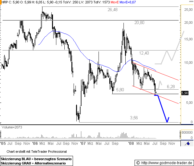 Fällt die Aktie auch nachhaltig unter 5,80 Euro zurück, dürfte eine Stop Loss Welle losgetreten werden und ein weiterer Kapitalentzug folgen. Mittelfristige Kursverluste bis 3,60 Euro werden dann wahrscheinlich.