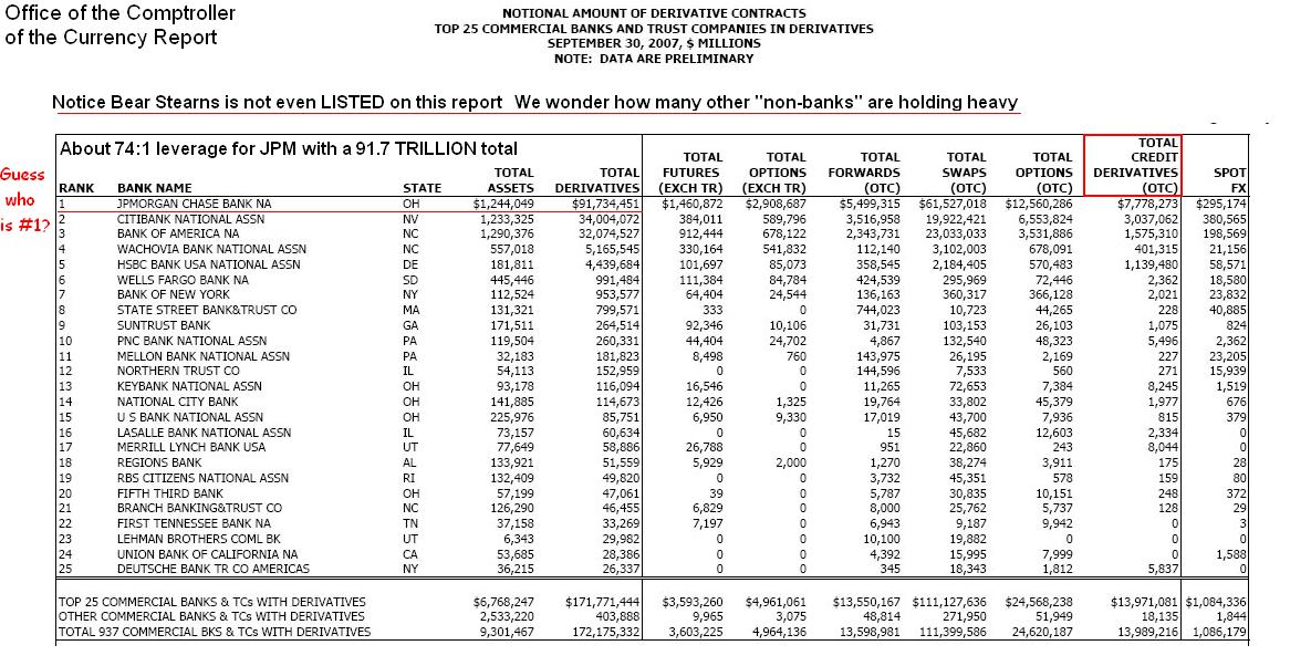 Notice that Bear Stearns is not EVEN LISTED as holding derivatives in any of the tables we looked at in the OCC Report. Is this because of their 'non-bank' status? We wonder how many other US corporations are loaded up with derivatives as well.