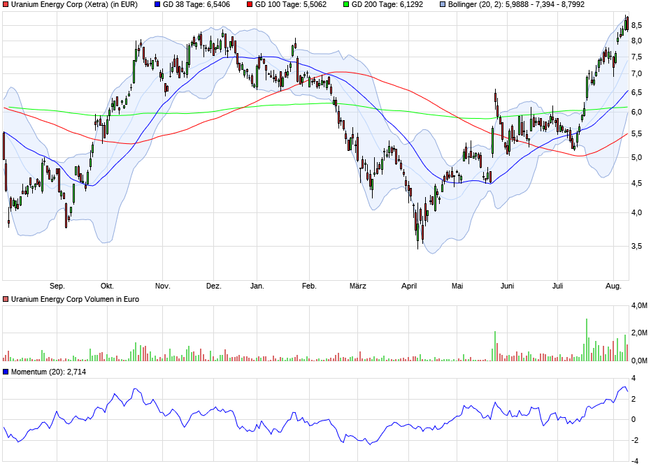 Wir sind am ATH. Wir haben heute mit einer großen roten Kerze den oberen Rand des Bollingerbandes berührt, stehen mit Schlußkurs darunter. Momentum ist etwas nach unten. Wir bewgen uns aber noch im überkauften Bereich. Wenn es aber weiter genug Käufer gibt ist alles gut. Wir haben das nächste (realistische) offene Gap unterhalb zw. ca. 7,88 bis ca. 7,65 €. Zufällig wird in diesem Bereich auch die nächsten 2-4 Tage die Mitte des Bollinger Bandes sein. Tja was soll ich sagen....könnte ich mir realistisch vorstellen, dass zu schließen und von da ab wieder gen Norden zu ziehen. Meine Hand möchte ich aber nicht dafür ins Feuer legen. Geschlossen wird es früher oder später, das ist sicher. Wann weiss ich nicht. Genau genommen gibts noch 3 tiefere. Auch die werden geschlossen, irgendwann. Bitter ist, dass das tiefste zw. ca. 4,72 und ca. 5,0 € liegt... Leider ist das immer so, bzw. war es die letzten 15 Jahre so. So hier der Chart dazu: |