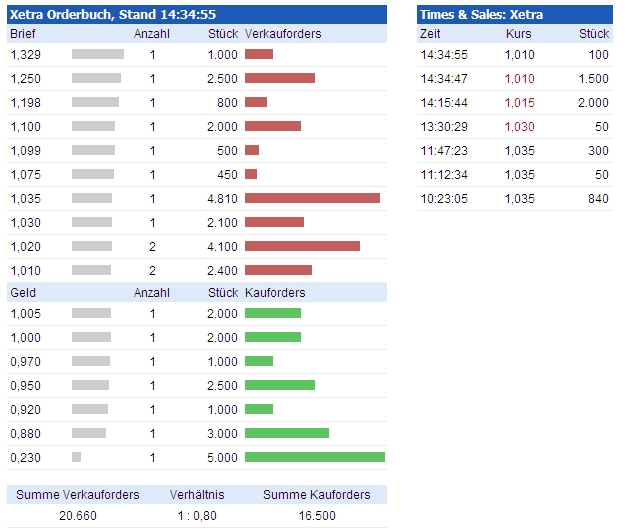 Heute 1500 zu 1,01 gekauft. Wenig später stehen (in der Regel die selbe Menge) 2000 zu 1,01 im Brief (im Angebot).