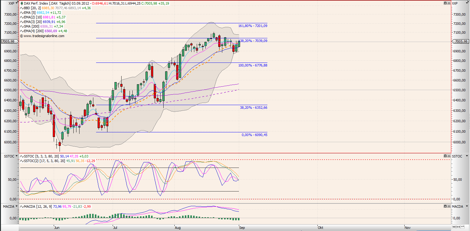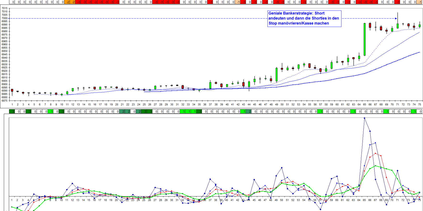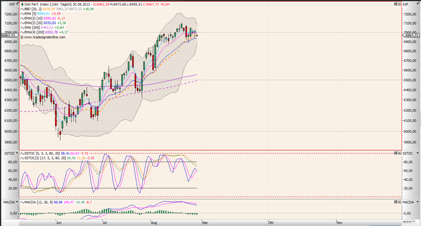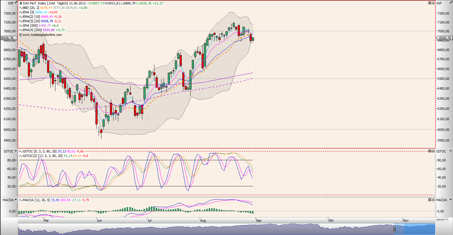 Moin, moin, Das ist jetzt keine Handelsempfehlung, dafür aber ein klares Bild. Im Dax (TF-Tag) tut sich langsam was. Gestrige Tageskerze liegt unter SMA 20 (gestrichelte orange Linie) Eröffnung heute ebenfalls unter der SMA 20, Indikatoren fallen. Wenn nicht wieder irgendwelche irren finanzpolitischen Entscheidungen getroffen werden, kann das nur -short - bedeuten. Es ist schon richtig, dass es immer wieder (undurchschaubare?) Seitwärtsphasen gegeben hat und auch in Zukunft geben wird, sie waren allerdings selten von der Art komplizierter, globaler Finanzpolitik begleitet, wie zur Zeit. Diese "Unwegbarkeiten" sind, da nicht vorhersehbar, analytisch nicht umsetzbar. VG annno |