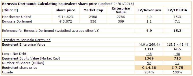 90 Millionen zu einem moderaten KGV von 8 würde bereits bedeuten das der BVB etwa um 720 Millionen Eurohöher bewertet sein müsste als Juventus (der über der Börse auf ein Unternehmenswert (EV) von etwa 360 Mio. Euro veranschlagt wird)."