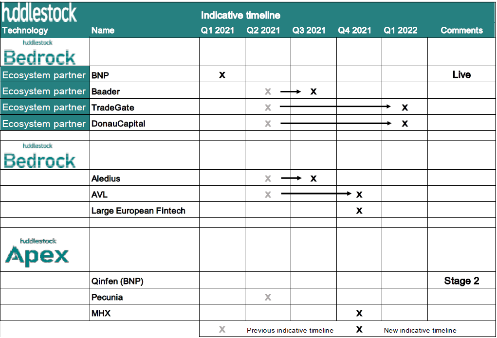 Aledius, AVL und eine große europäische Fintech/Bank haben Huddlestock in dem halben Jahr bezahlt für Kundenwünsche (Anpassung der Software). Für AVL und die große europäische Bank stehen der endgültige Vertrag noch aus, jedoch sind die Vertragsunterlagen finalisiert und müssen nur noch unterschrieben werden.