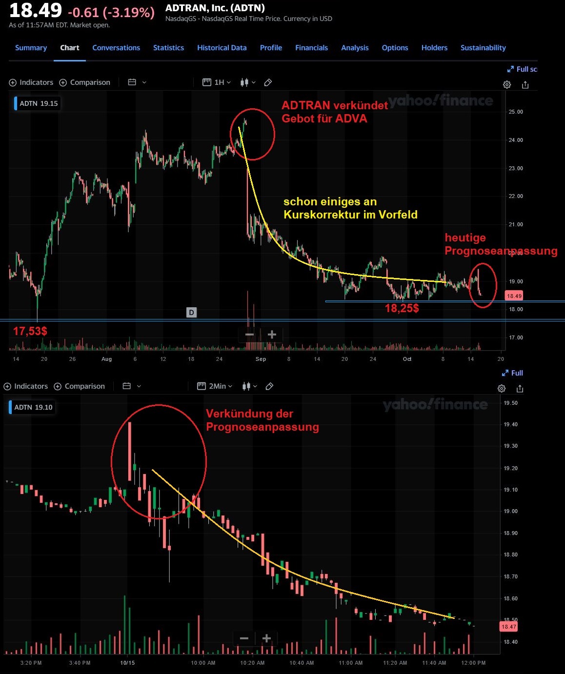 Bei ADTRAN ist der Kurs ja schon seit der Verkündung des Angebotes für ADVA heftigen geschmolzen . Vielleicht ist also dadurch die Reaktion auf die Gewinnanpassung nicht mehr ganz so heftig, weil der Kurs eh schon ein gutes Stück konsolidiert hatte und ja zumindest der Auftragseingang weiter gut ist ( den man aber eben wg. Problemen bei der Zulieferkette schlechter / kostspieliger bedienen kann). Durch den fallenden ADTRAN Kurs ist natürlich auch das Angebot von ca. 0,8 ADTRAN Aktien für 1,0 ADVA Aktie immer unattraktiver geworden und kann daher auch weniger unterstützend den ADVA Kurs beeeinflussen. Lassen wir und mal überraschen wie das Kursgeschehen weitergeht. und ob es vielleicht nochmal Anzeichen gibt, daß ADTRAN sein Angebot nachbessert, wenn der ADTRAN Kurs weiter so unvorteilhaft bleiben sollte für ADVA Aktionäre. Also ich kann auch gut damit leben, wenn ADVA alleine weitermacht.