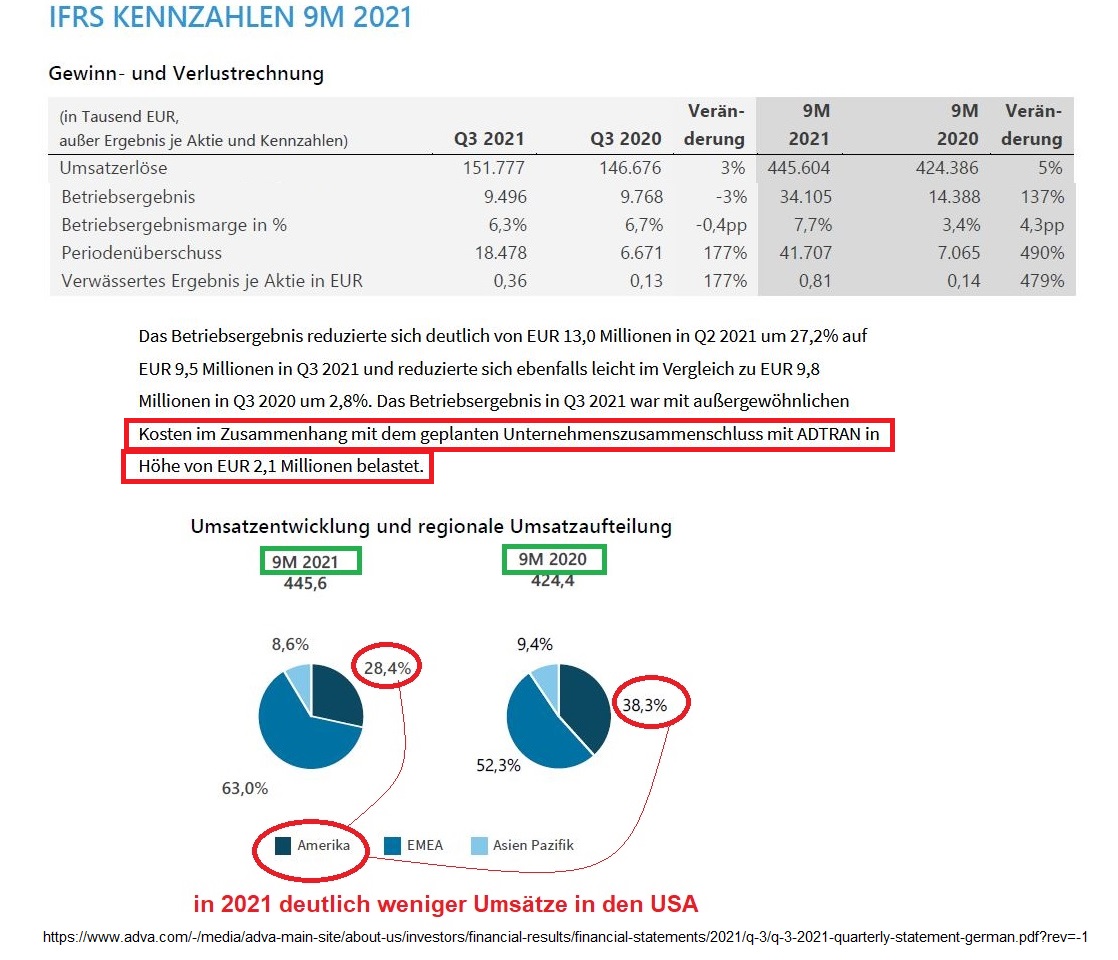Also die Prognosespanne wird jetzt erstmal weiter bestätigt. Von daher keine Überraschung. Allerdings ist die Prognose bislang auch nicht sonderlich "ambitioniert" gewesen bzgl. Umsatz. Somit natürlich leichter jetzt in dieser Spanne weiter zu bleiben, wenn diese Versorgungsproblematik weiter anhält in 2021. Leider hat man seitens ADVA jetzt auch für 2022 die Erwartung, daß diese Versorgungsknappheit noch länger anhalten wird als bislang angenommen. Von daher wird 2022 wohl (mehr/länger) Dämpfung bei den Ergebnissen bringen als bislang angenommen. Die Marge in 2021 ist sicherlich deutlich besser als in 2020. Was aber auch kein Wunder ist, weil man 2020 sehr kalt erwischt wurde vom Corona-Ausbruch und den Auswirkungen von viel Produktionsstillstand in China, sowie den Sanktionen gegen chinesische Firmen durch die USA/Trump (was man seitens ADVA dann 2020 versuchte durch Verlagerung in asiatische Nachbarländer zu kompensieren, was aber 2020 auch damit temporär Mehrkosten verursachte). Leider hat es jetzt auch in Q.3 21 noch eine Mehrbelastung gegeben von 2,1 Mio € im Zusammenhang mit der kursschädigenden Idee der Vereinnahmung durch Adtran. Diese Idee hassen aber scheinbar so ziemlich alle Aktionäre auf beiden Seiten außer den Nasen im Management.