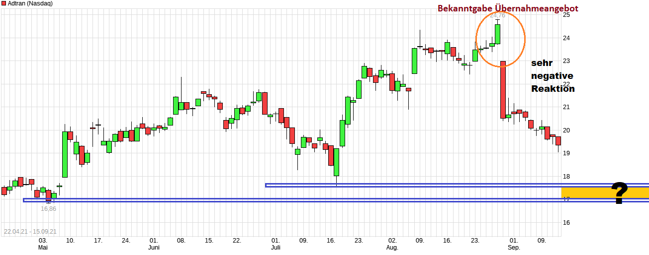 Problem an diesem wenig vorteilhaften Übernahmeangebot von Adtran ist nunmal, daß man als ADVA Aktionär mit Aktien der US-Butze "abgefunden" werden soll anstatt hier ein verbindliches Cash-Angebot zu machen ( für eine ADVA Aktie soll man 0,8244 Adtran Aktien bekommen). Solange die Adtran-Aktie also noch weiter fällt ( weil offenbar deren Aktionäre diese Übernahme-Idee auch nicht mögen), wird das Übernahmeangebot inzwischen vom Umrechnungskurs her immer alberner für ADVA-Aktionäre. Man kommt nun wieder in Regionen wo man eh schon alleine vor dem Angebot war. Dieses inzwischen ungünstige Adtrans-Angebot fürdie ADVA Aktie lähmt, da dieser ganze Prozess sich ja laut der ADVA Adhoc bis ins Q.3 2022 ewig hinziehen kann. Es müssen vorher viele Hürden auch noch genommen werden. Nicht nur die 70% Annahmequote. Es bedarf auch noch der Zustimmung der HV von Adtran, der Zustimmung der Behörden und es darf sich nichts Negatives bei ADVA ereignen.