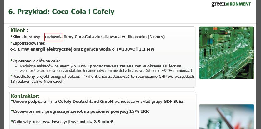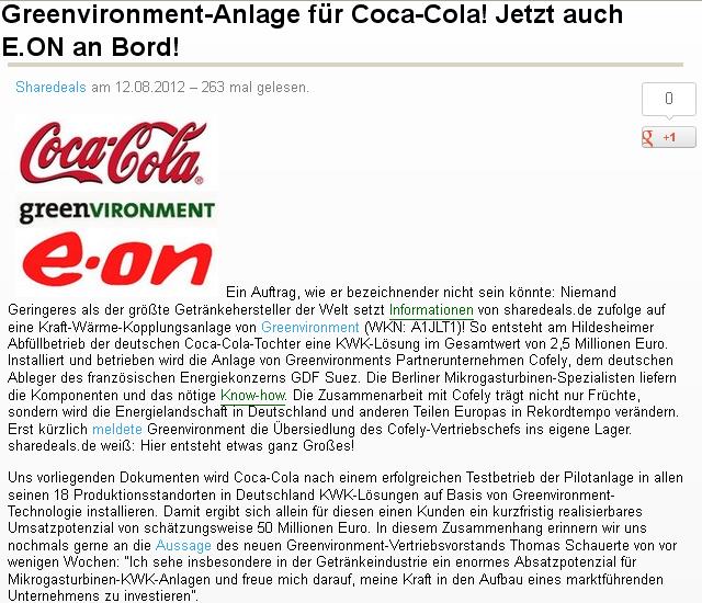 Sehr geehrter vielen Dank für Ihre Anfrage vom 12. Juli 2012. Wir können eine Partnerschaft mit Greenvironment bzw. ein gemeinsames Projekt nicht bestätigen. Beste Grüße, ![]() Sehr geehrte Frau Schenk, in diversen Foren munkelt man bezüglich der Umweltfreundlichkeit von Coca Cola. Hier heißt es, das Coca Cola stark am internen dezentralen Energie Versorgunglösungen arbeitet, wie eventuell kraft Wärme Kopplungsanlagen in Ihren Abfüllbetrieben in Deutschland. Konkret heißt es hier das sie demnächst kwk Anlagen der Firma Greenvironment einsetzen werden um Ihren Beitrag zum grünen Energiewechsel als großes Industrieunternehmen beizutragen, bzw. bereits einen Auftrag fix erteilt haben für eine Ihrer Abfüllanlagen. Dies ist sehr positiv für Coca Cola anzusehen wird jedoch von Coca Cola in keiner Pressemitteilung erwähnt und ist somit leider nicht als positive Außenwirkung für Coca Cola zu erkennen. Als ein Verfechter der grünen Energie und Energieeinsparungskonzepten finde ich dies Schade, wenn es so wäre und würde mich freuen wenn Sie dies mehr in die Öffentlichkeit tragen würden, da es als Ansporn für andere Unternehmen dienen könnte. Über eine Antwort ob dies alles nur Gerüchte sind würde ich mich sehr freuen. |