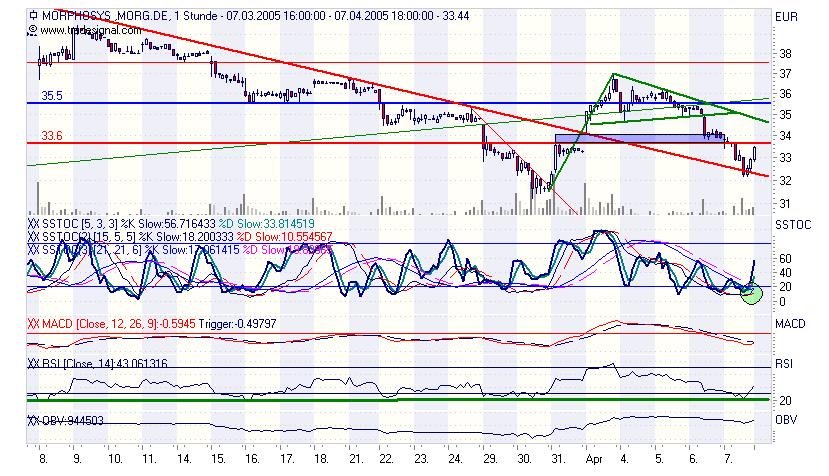 Kurzzusammenfassung: Analyst: LB Baden-Württemberg Rating: Kaufen Kurs: 32.25 EUR KGV: 49.7 Kursziel: 38 EUR Update: upgrade WKN: 663200 MorphoSys: Kaufen 08.04.2005 09:43:46 Die Landesbank Baden-Württemberg stuft die Aktie des deutschen Biotech-Unternehmens MorphoSys AG am 8. April von "Verkaufen" auf "Kaufen" herauf. Das Kursziel wird mit 38 Euro angegeben. Der Höhenflug des Aktienkurses sei von den Jahreszahlen 2004 gestoppt worden, und die im März vollzogene Kapitalerhöhung (über 490.133 Aktien zu 35,50 Euro) habe Gewinnmitnahmen ausgelöst. Der geringer als erwartete Gewinnausweis für 2004 und die Verwässerung durch die Kapitalerhöhung würden zu den reduzierten Gewinnerwartungen für 2005 führen. Im Folgejahr könnten aber mit den Mitteln der Kapitalerhöhung finanzierte Akquisitionen und höhere Milestone-Zahlungen aus Projektfortschritten zusätzliches Wachstum generieren. Nach dem Kursrückgang sei die Aktie unterbewertet, und die Analysten erhöhen trotz der Unsicherheit über die mögliche Stattgebung einer Patentklage ihr Rating von "Verkaufen" auf "Kaufen".