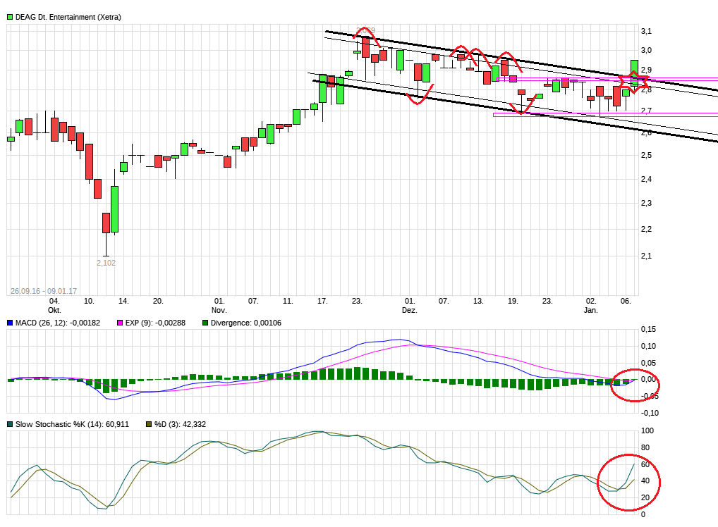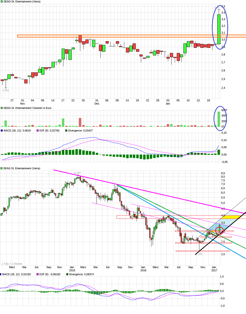 Nichtsdestotrotz, DEAG ist so oder so ein potenzieller Turnaround-Kandidat, der aber noch immer eine recht dünne Cashdecke noch hat nach den kostspieligen Vorfällen im Jahr 2015 und wo nichts mehr irgendwie nochmal schief gegen darf, damit man nicht in die Not kommt weiter Kapitalmaßnahmen durchzuführen. Der starke Einbruch des engl.Pfundes ist unschön und könnte auch noch weiter gehen. Eine Notierung in England wird auch Geld kosten. Ob da wirklich nennenswert Leute auf der Insel dann deswegen DEAG kaufen wollen? Alles ungewiß. Ich schau mit jetzt einfach das Chartbild an und handle im Kern danach. Aktuell scheint man sich über die Region um die 2,75 zu kämpfen. Käme aber bei ca. 2,95 schon wieder an eine weitere wichtige Hürde. Da könnte sich zeigen, ob man es schafft sich aus der großen seit Anfang Juli2015 bestehenden Seitwärtslage rauszuarbeiten. Das müßte man nachhaltig überwinden und danach verteidigen. Hoffen wir mal es gelingt.