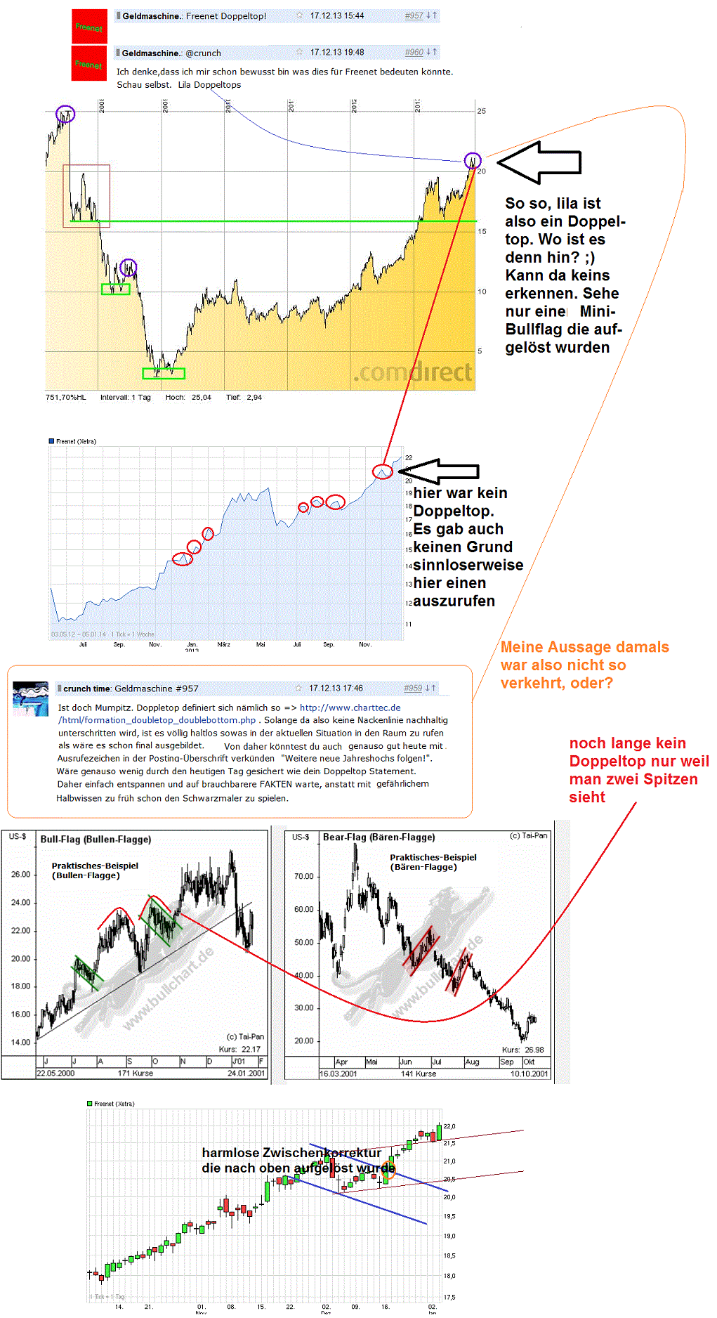 Nichts für ungut, aber das Problem scheint, daß dir nicht hinreichend bewußt ist was ein Doppeltop wirklich ist. Lediglich Spitzen zu sehen reichen dafür nicht. Da muß mehr vorliegen. Ansonsten müßte man doch alle paar Wochen "Doppeltop" ausrufen mit einer Tefferquote im einstelligen Prozentbereich. Wie man sieht war es ja dann auch rückblickend falsch von dir die jüngste Chartlage (die du lila umkreist hattest  = Doppeltop nach deiner Aussage) schon als Doppeltop zu titulieren. Objektiv betrachtet war dafür jedoch zu keinem Zeitpunkt ein hinreichender Grund vorhanden. Ohne eine signifikant und nachhaltig unterschrittene Nackenlinie ist es sinnlos und zu voreilig Doppeltop auszurufen. So hat man vielmehr mal wieder eine normale kleine Zwischenkorrektur bzw. Bullflag gesehen in einem weiterhin noch völlig intaktem übergeordnetem Aufw.trend bei Freenet. Also einfach mal entspannt an die Dinge gehen, nicht schon einen emotional negativen Bias im vorhinein haben und nicht z.B. Börsenanfänger ohne Schimmer von CT verunsichern und eventuell damit zum Verkauf bringen, obwohl kein Grund dazu bestünde.