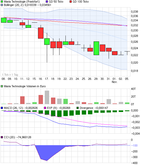 Hallo. Keine Forenaktivität... Hmm... Bin kein pusher, um das vorab fest zu halten...! Seht euch den MACD an. Eindeutiges Signal, dass das Teil starten möchte. Ich habe erwartet, dass der DAX weiter fällt und Gelder abgezogen werden und zum geringen Teil in Penny´s wandert, was aber gerade bei Penny´s für Volumen sorgt und bei solchen Chartsignalen wie hier für einen Ausbruch sorgt. Hmm... Mal sehen was die (im Augenblick) trendsetter aus den USA wegen der Wahl und der Rezessionsangst für wirbel in den Märkten sorgt. ... Gerade wenn professionelle ihre Depotstücke neu "verteilen" beschäftigen die sich mit eben den Signalen und platzieren in diesen Aktien ihre Order um diese zu ziehen... Wie gesagt, ich behalte MANIA stark unter Beobachtung. Zu viel Indikatoren sprechen im Moment für den Anstieg. Das ist lediglich meine Meinung und auf keinen Fall eine Empfehlung oder der gleichen. Einjeder ist für sein handeln selbst verantwortlich! |