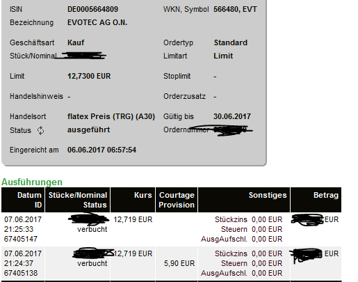 da aber laufe des tages zu erkennen war im dax und bei evotec das ich evotec nicht mehr zu weniger als 12,6 bekommen werde...musste ich abend in der nachbörse moch einmal zu schlagen zu 12,71y.....immerhin noch 17 cent billiger rein..und weitere 340 euro gespart.....