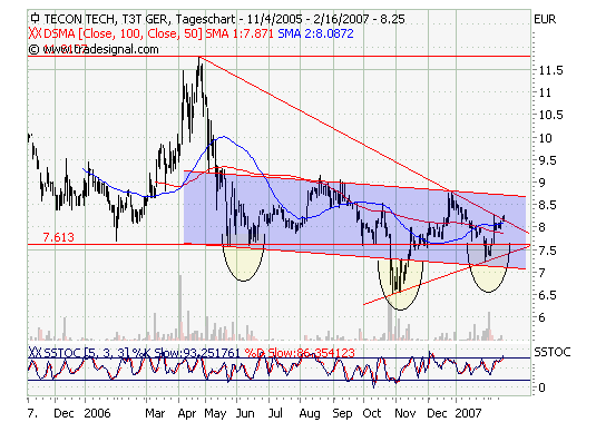 Ich erwarte für Tecon eine ähnlich positive Entwicklung wie von der S&T. Man hat bewiesen, dass man in der Lage ist, deutlich stärker als der Markt zu wachsen. Die Ertrags-Hebel auf die Umsätze schätze ich als signifikant ein, woraus ich (bei konservativer Berechnung !) für 2007 ein aktuelles KGV von 7,6 errechne und eine Kursverdoppelung für gerechtfertigt ansehe.