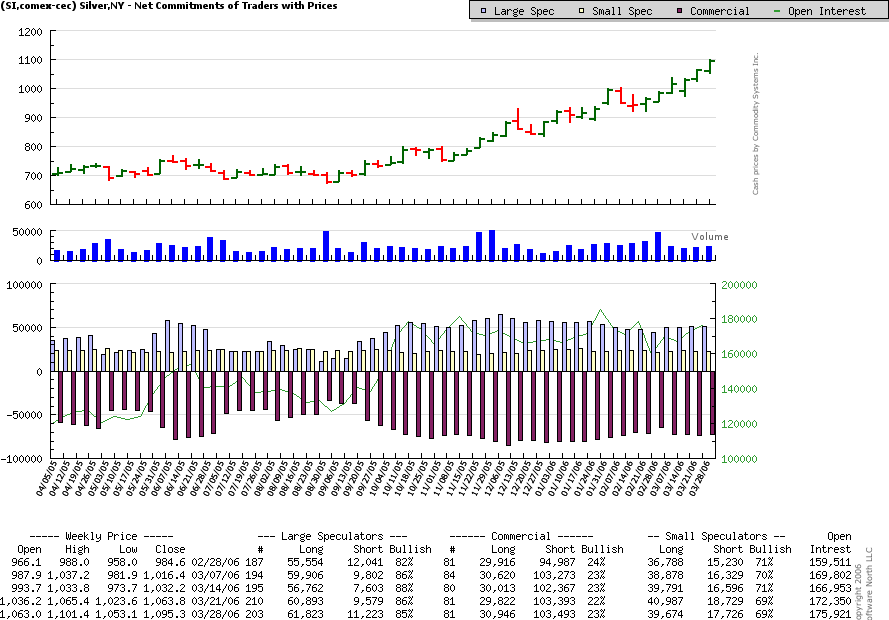 Ich kann mir 2006 Kurse von 20$ vosrstellen, aber es dürfen die einflußreichen Leute an der Comex nicht vergessen werden, die auf riesigen Shortpositionen sitzen. Die werden alles nur erdenkliche versuchen, um keine Verluste einzufahren. Die könnten nochmal einen starken Kursrutsch bei Silber auslösen. Die nervösen werden dann alle verkaufen und die Shortis werden dann billig einkaufen, danach wird der Silberpreis explodieren. Das ist aber reine Phantasie von mir, ich weiß es ganz einfach selber nicht, was passieren wird. Aber eines weiß ich mit Sicherheit, und das ist, das der Silberpreis explodieren wird, ob dieses Jahr oder nächstes, ob mit starken Rückschlägen oder nicht, ich werde dabei sein und werde mich auch nicht verängstigen oder rausdrängen lassen.
