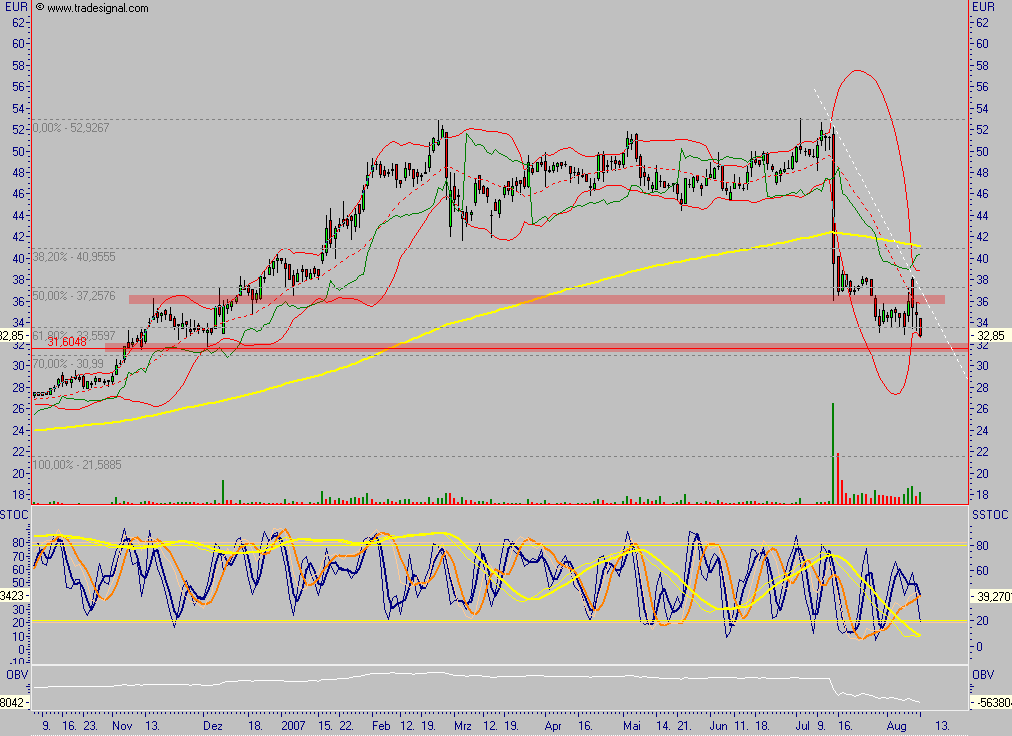 Andererseits: Die Firma hat eine ausreichend solide Bilanz. Selbst wenn man der Hafensparte 2008 gar keinen Gewinn zubilligt, käme Demag auf eine Marge von über acht Prozent. Die Aktie wäre immer noch ein Drittel billiger als der Sektor. Wer gute Nerven hat, sitzt die Zeit der Unklarheit aus und profitiert dann von der wahrscheinlichen Erholung