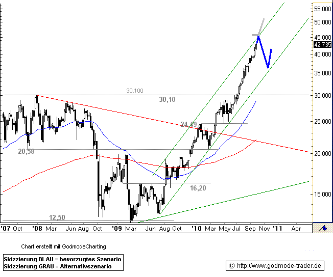Im März 2010 gelang dem Wert der Ausbruch über den Abwärtstrend seit Januar 2008 im 2. Versuch. Mitte Juli durchbrach die Aktie ihr Allzeithoch bei 30,00 Euro. Seitdem kennt der Wert kein halten mehr. Fast jede Woche erzielt sie ein neues Allzeithoch. Inzwischen kletterte der Wert bereits auf 42,97 Euro.
