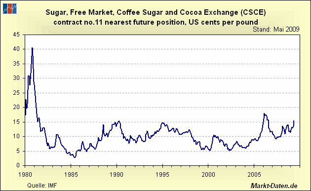 Zuckerrohr ist eine kapriziöse Pflanze. Sie benötigt große Hitze und viel Regen -, aber auf keinen Fall während der Erntesaison - und auch sonst sollte sich das Wetter am besten nach den Wachstumsphasen der Pflanze richten. Wenn das Klima jedoch nicht mitspielt, entsteht schnell ein Defizit auf dem Zuckermarkt und die Preise schießen in die Höhe - wie sich an dem Chart für den Terminkontrakt Nummer 11, der im Oktober fällig wird, ablesen lässt.