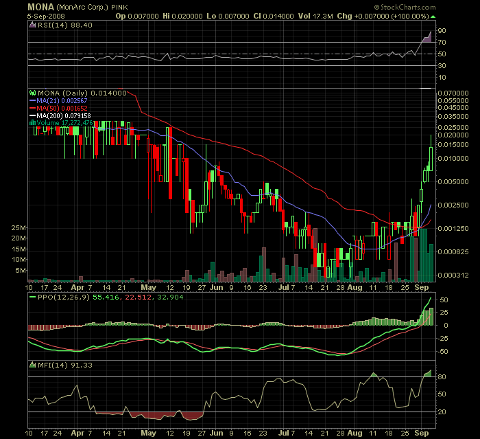 Der Schlußkurs von .014 US$ entspricht knapp .01 Euro! Meine Hoffnung ist es nämlich, dass die Deutschen am Montag ordentlich vorlegen (da sie den Wert von MONA erkennen übers Wochenende!), aufdass ein fettes UP-Gap und ein mächtiger RUN auf die MONA Aktien ausgelöst wird bei Eröffnung in USA!
