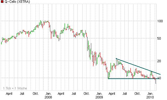 charttechnisch war der fall unter die 10 euro das todesurteil für q-cells. nach unten gibt es keine unterstütung mehr. ich würde also nicht schon im voraus posaunen wann ich in so einer charttechnischen verfassung long gehe. der boden muss sich nun finden und der wird schon früh genug erkennbar sein... hier braucht keiner jammern der anteilsscheine von q besitzt. bei einem so schönen fallenden dreieck, das q die letzten monate ausgebildet hat, hätte es genug gelegenheiten gegeben die reißleine zu ziehen. ----------- IN CHARTS WE TRUST |
