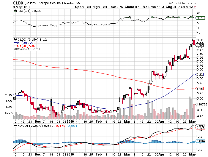 My thesis is that your portfolio can gain some real alpha by holding CLDX. When I bought it at 4.50 and again at 5.20, it was a no brainer due to an artificially low share price caused by Medarex/BMY forced share sales. Key points to the bull case include solid balance sheet, upcoming results at ASCO on various programs (especially Pfizer partnered CDX110 for brain cancer), insider buys, possible additional partnerships, and the overall favorable light that Immunotherapy ¨Vaccines¨ find themselves in after Provenge´s approval.