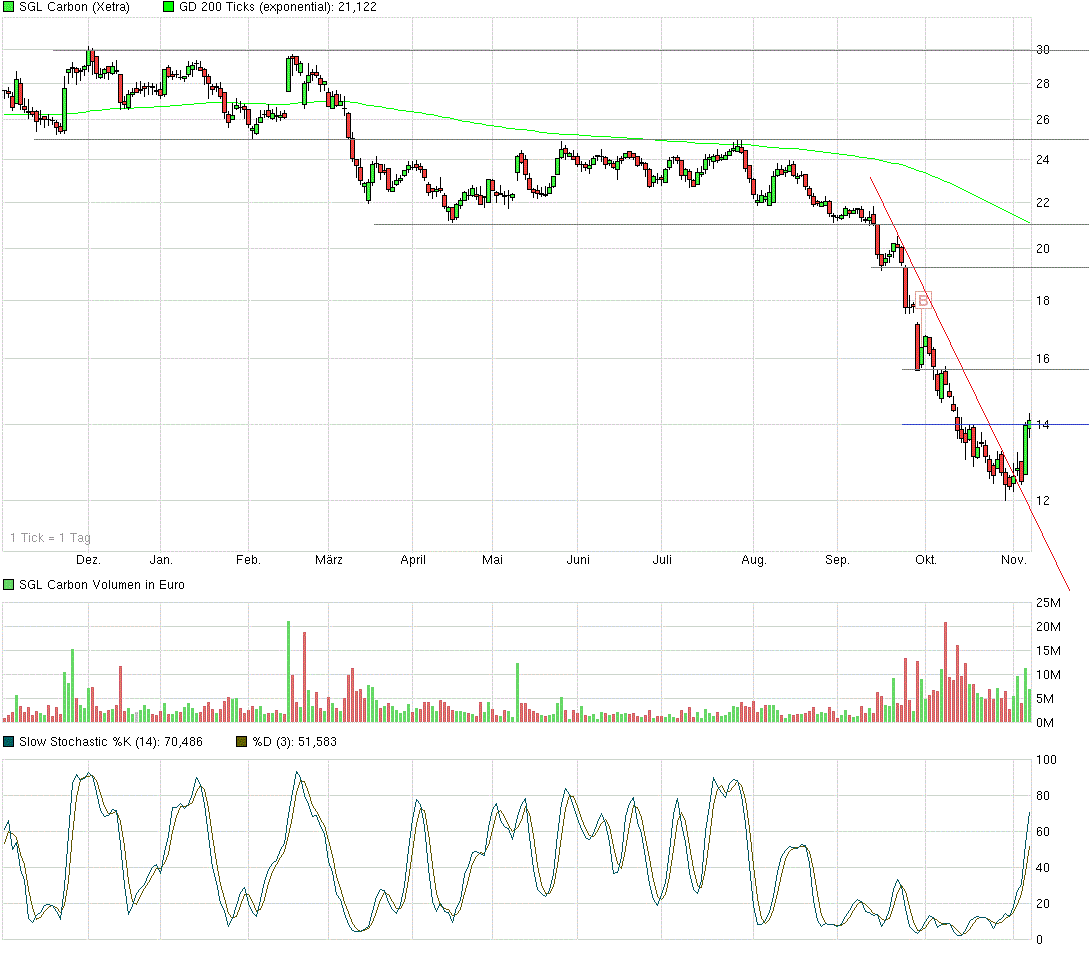 Was das Ende des Kursverfalls und die Bodenbildung anbelangt, habe ich neulich in #104 meine Ansicht dazu mitgeteilt. Meine damalige Einschätzung ist bisher voll aufgegangen. Jetzt kommt es darauf an, dass das Verlaufshoch vom 10.11. bei 14,50 Euro nachhaltig überschritten wird. Erst dann werde ich meine Turbos aufstocken, da man erst dann vor einem neuerlichen Rückfall in Richtung 13,- Euro einigermaßen sicher sein kann. Dennoch: es schaut wieder ganz gut aus und SGL dürfte von nun an öfter mal der Bringer des Tages sein. Wie einst im Mai...;-) |