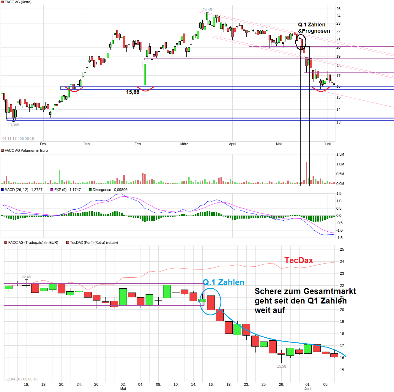 Viele Investoren sind voriges Jahr eingestiegen, alle hatten Sie hohe Erwartungen. Das Unternehmen brachte voriges Jahr gute Quartalszahlen und super Aussichten, dann kam das Quartalsergebnis Anfang Mai und der Umsatz veränderte sich kaum, dennoch sind die Auftragsbücher voll, die Dividende wurde erhöht und so weiter, aber wenn da jetzt 10.000 Investoren innerhalb eines Jahres 160% Gewinn machen (von 8 auf gut 20,00) und nervös werden das die eine Kapitalerhöhung oder sowas ähnliches durchführen, dann ist es klar das die ihre Gewinne mitnehmen und der Kurs sich halbiert.