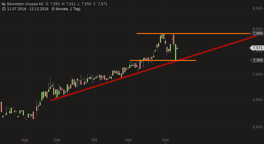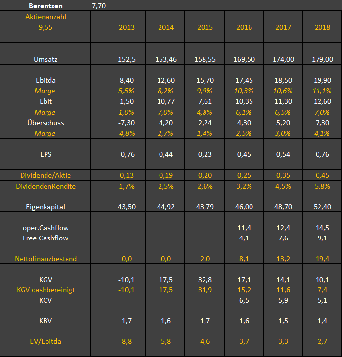 für Berentzen! Habe mich in den letzten Wochen intensiv mit Berentzen beschäftigt und bin sehr hoffnungsfroh. Die Firma hat einige sehr schwierige Jahr hinter sich, aber 2016 ist die absolute Trendwende. Die abgelieferten Zahlen für Q1-Q3 2016 haben in allen drei Bereichen Spirituosen, Alkoholfrei und Säfte sehr ordentliche Zuwächse beim Umsatz und Gewinn gebracht. Im Jahr 2015 wurde ein Umsatz von 158,5 Mio € und ein Konzernergebnis von 2,2 Mio € erreicht. Ich rechne konservativ für 2016 mit 172-179 Mio € Umsatz und 2,5-2,8 Mio € Gewinn, wobei die Dividende bei 0,25 € liegen sollte. Berentzen hat u.a. für Sinalco mehrere Kampagnen u.a über die Handelskette Hol Ab gefahren. Im Bereich der Spirituosen hat man den Umsatz über Aktionen bei Kaufland, Edeka und Rewe kräftig angekurbelt. Aber auch der Bereich "Saft" entwickelt sich prächtig und man darf für 2016 mit einem Umsatz von wenigstens 21,5 Mio € rechnen. Der Kurswert liegt aktuell bei 7,72 € und spätestens wenn die Zahlen für 2016 im März 2017 verkündet werden sollten wir uns locker richtig 9,-€ bewegen. Wenn das Unternehmen die Trendwende so erfolgreich weiterführt, sollte die Aktie auf Jahressicht die 10,-€-Grenze locker überspringen. |