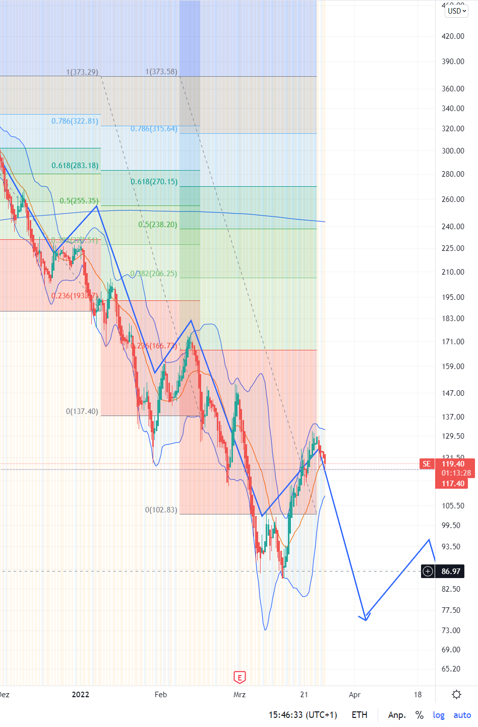 Kurs ist erneut unter die alte Retracekante gefallen, damit steigt wieder die Wahrscheinlichkeit, dass der Kurs weiter der Prognose folgt.