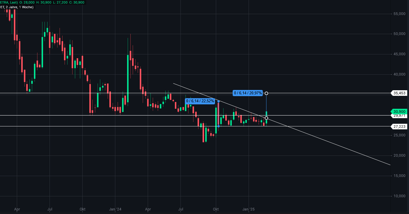 ca. 28,50 – 35,00 Euro zurückzuerobern. Zudem wurde auch die 200-Tagelinie überwunden (zweites Kaufsignal). Mal schauen, ob das nächste Ziel (35 Euro) schnell überwunden wird.