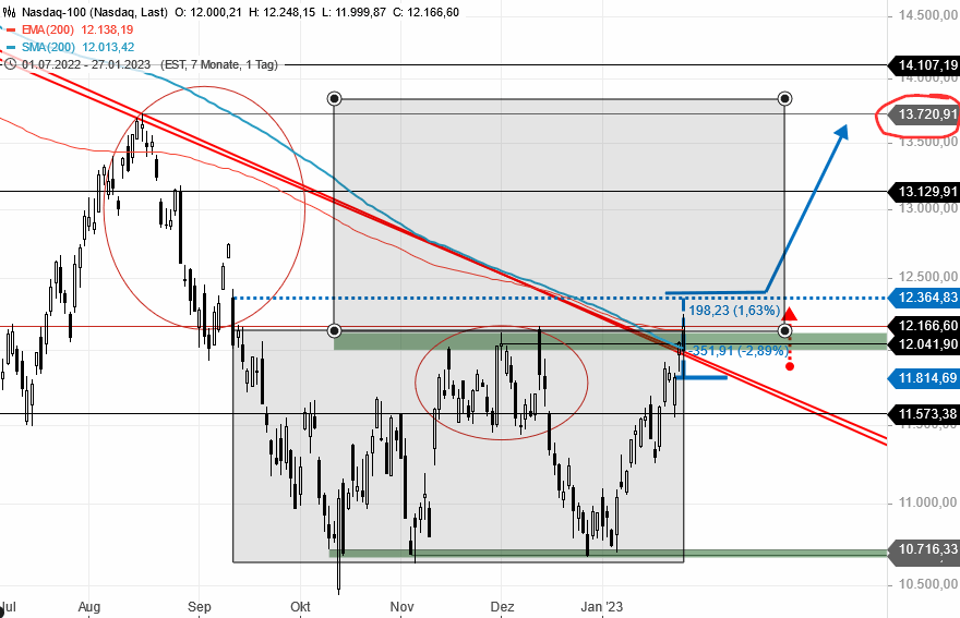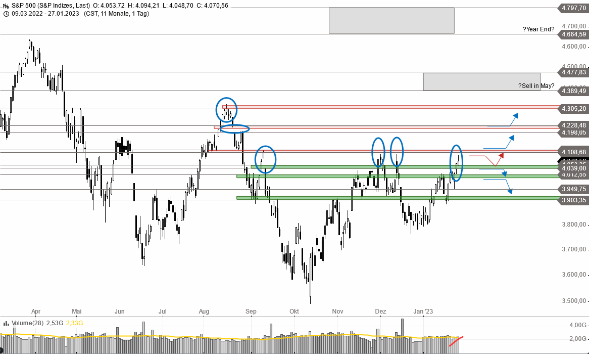 in der Tat sind die Möglichkeiten unendlich. Das macht das Leben so schön! Der erste Börsenmonat neigt sich dem Ende zu mal Zeit & Gelegenheit nutzen zur Nachschau / Vorschau: Das Sentiment kann schön in den Nachbarforen abgelesen werden: bärisch/pessimistisch, wie soll es dann anders sein - es steigt mit steigendem Volumen, zumindest bei den Amis. Der Dax hat ja bereits über 1000 Punkte hinter sich & schiebt einfach nur Konso... da gibt es ausser Range seit zwei Wochen nix zu sehen! Die oben genannten Ziele (S&P: 4100=fast erreicht, Dow über 24k) waren doch eine gute Abschätzung! Um mal eine weitere Abschätzung vorzunehmen lohnt sich immer ein Blick auf den Dicken, die "Mutter" aller Indizes. in den vergangenen Wochen wurden zwei Böden ausgebildet, gehts oben raus, stehen die Ziele im Chart, nur die Frage einer zeitlichen Projektion sind schwieriger, schauen wir einfach mal was passiert! In der nächsten Woche darf ab Mittwoch mit ordentlich Schwung in der Bude gerechnet werden: Mittwoch Fed & Metaface, Donnertag EZB, Google & Amazon, Freitag NFP, wobei letzterer häufig Trendtage sind.
