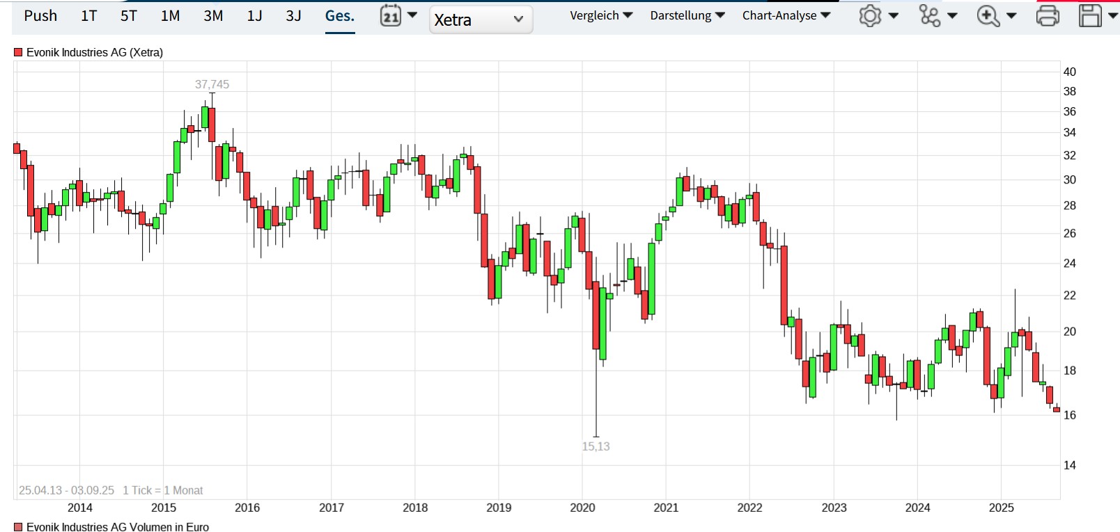 In den letzten Jahren gab es immer wieder Berg und Tal und 1,17€ Dividende (die man hätte ignorieren können, wenn man einen klaren Blick in die Zukunft gehabt hätte):