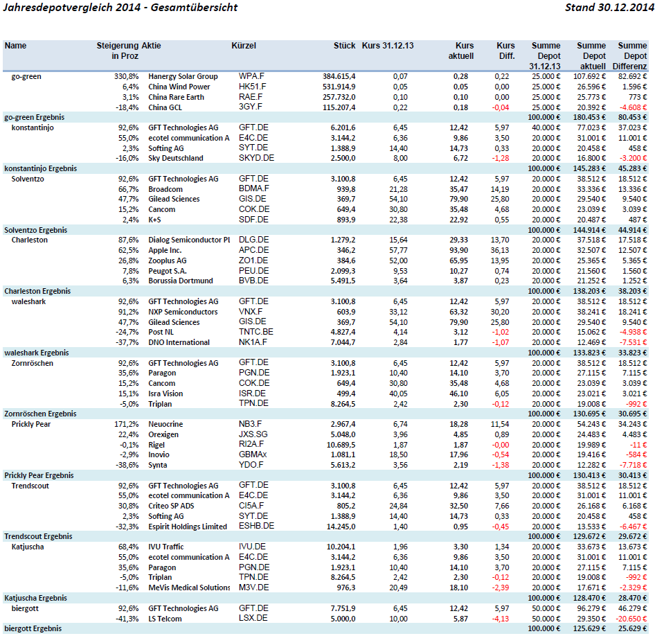 Natürlich schade, dass ausgerechnet ich mich vor einem Jahr dafür entschieden hatte, GFT rauszulassen, weil ich neue Werte statt meiner damals bekannten Favoriten aufzunehmen. Hatte mir gerade von Triplan genauso viel erhofft, aber okay, ... letztlich sind 28,5% ja auch nicht schlecht. Hätten mit GFT statt Triplan oder der zu spekulativen Mevis auch um die 40% sein können. Bin dennoch zufriden. Mein Ziel den Dax klar outzuperformen und unter die Top10 des Wettbewerbs zu kommen, hab ich erreicht.