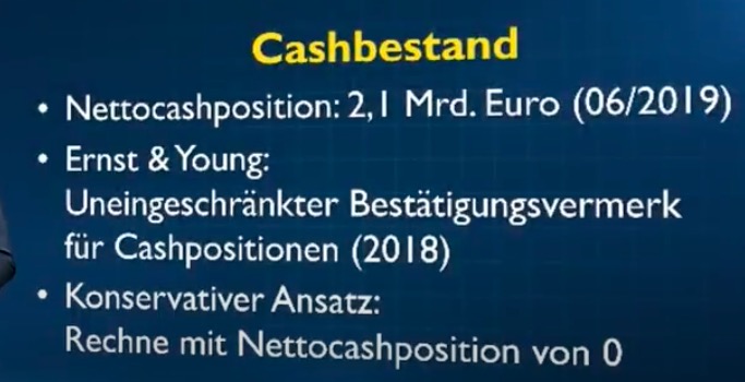ES gibt 3 Treuhänder: TH1, TH2 und TH3. Dabei fällt der größte Anteils des Kapitals (>80%) auf TH1. E&Y hat sich vermutlich all die Jahre mit den reinen Saldenbestätigungen des TH1 zu Frieden gegeben. Es liegen jedoch keine Bankbestätigungen/Kontoauszüge für die Baken des TH1 vor. Dies hat KPMG bemängelt und damit E&Y indirekt gezwungen das in der Zukunft zu berücksichtigen. Siehe DGAP heute morgen: "Frühere erteilte Bestätigungen der Banken wurden vom Wirtschaftsprüfer nicht mehr anerkannt. " Im Untersuchungszeitraum 2016-2018 betrug die Einzahlungen bei TH1 circa 1 Milliarde, bemängelt werden aktuell jedoch 1,8€ Milliarde. Dies resultiert vermutlich hauptsächlich aus zusätzliche Einzahlungen aus dem GJ2019.