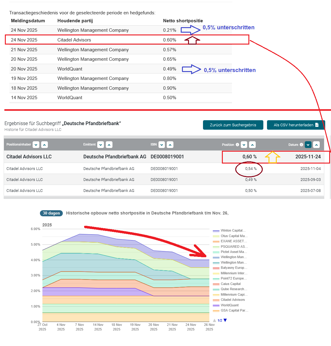 =============================== Das Problem beim Bundesanzeiger ist, daß dir die LV entgehen die bereits unter 0,5% wieder abgebaut haben (falls du nicht ständig vorher geschaut hast), da im Bundesanzeiger die Vorgeschichte mitgelöscht wird. Wer sehen will was auch vorher passierte, der ist mit shortsell.nl natürlich diesbezüglich besser bedient. So z.B. , daß am 20.11. WorldQuant die 0,5% (letzte Meldung dann 0,49%) unterschritten hatte oder am 24.11. Wellington Management Company die 0,5% unterschritten hatte auf 0,21%. Wer heute in den Bundeszeiger schaut wird darüber nichts mehr finden. Der einzige Nachteil bei shortsell.nl gegenüber dem Bundesanzeiger ist, daß oftmals mit einem Tag Verspätung Veränderungen eingearbeitet werden. Ansonsten aber kann man sagen, daß in den letzten zwei Wochen klar mehr abgebaut wurde an LV Position als erhöht. Alleine Wellington hat vom 18. bis zum 24.11. ca. 0,7% abgebaut und ich gehe davon aus, daß die bei dem "Fluchttempo" wohl auf 0% weiter abbauen, was aber nicht mehr zu melden wäre, da die letzte Meldung unter 0,5% bereits lag. Außer der Bagatelländerung von Citatel ( um 0,06%) am 24.11. gab es keine Erhöhung in den letzten Tagen. Die jüngsten Zahlen haben offenbar auf die LV keine sonderliche Anreize mehr ausgeübt hier nochmal deutlich auszubauen. Das Gegenteil ist aktuell eher zu sehen.