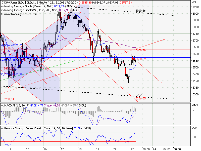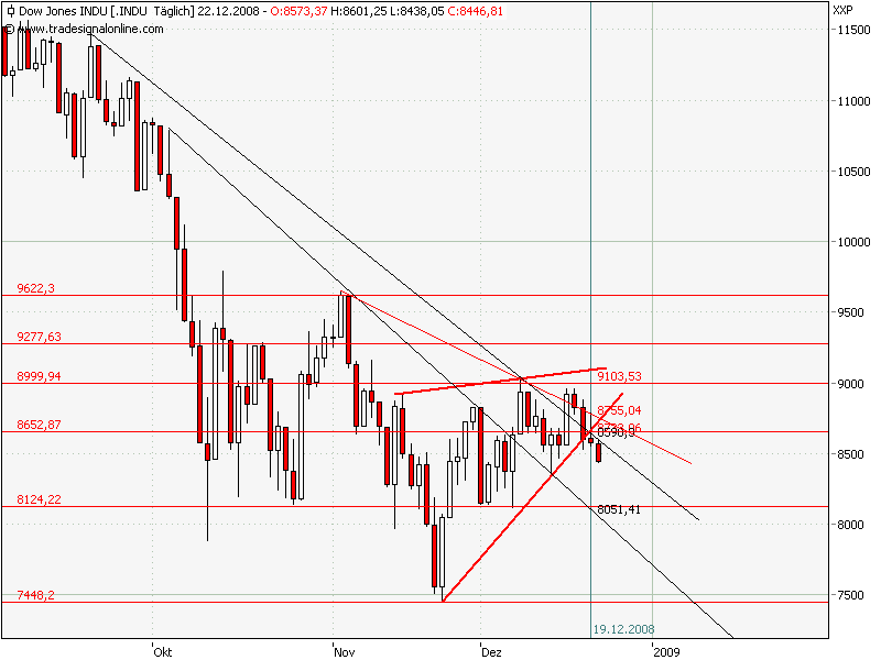 Als Chart habe ich den Dow im daily beigefügt. Der positive Verlauf vom 24. befindet sich noch innerhalb des Abwärtskanals, den ich als Ausbruch aus dem von mir gesehen bearishen Keil interpretiere.