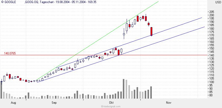 Google-Anleger leben gefährlich. Seit der Börseneinführung der Internet-Suchmaschine im August für 85 Dollar stieg der Kurs der Aktie kurzfristig über die 200-Dollar-Marke und fiel dann auf 165 Dollar zurück.