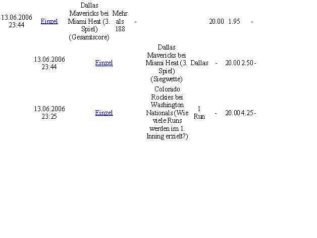 Da waren huet ne Menge gute Wetten dabei, aber betandwin hat sich diesmal richtig Mühe gegeben. War echt schwer ne Entscheidung zu treffen. Auf die "mehr als 188,5 Punkte" wollte ich auch erst setzen. War mir dann aber doch zu unsicher. Genauso interessant waren Wetten, wo man auf das Gesamtsore eines Spielers (z.b. Nowitzki mit mehr als 40,5 wenn man Punkte, Rebounds und Assists zusammenzählt) setzen konnte. Auch das war mir aber zu unsicher. Die marken waren schon gut getimed von betandwin für alle Spieler.