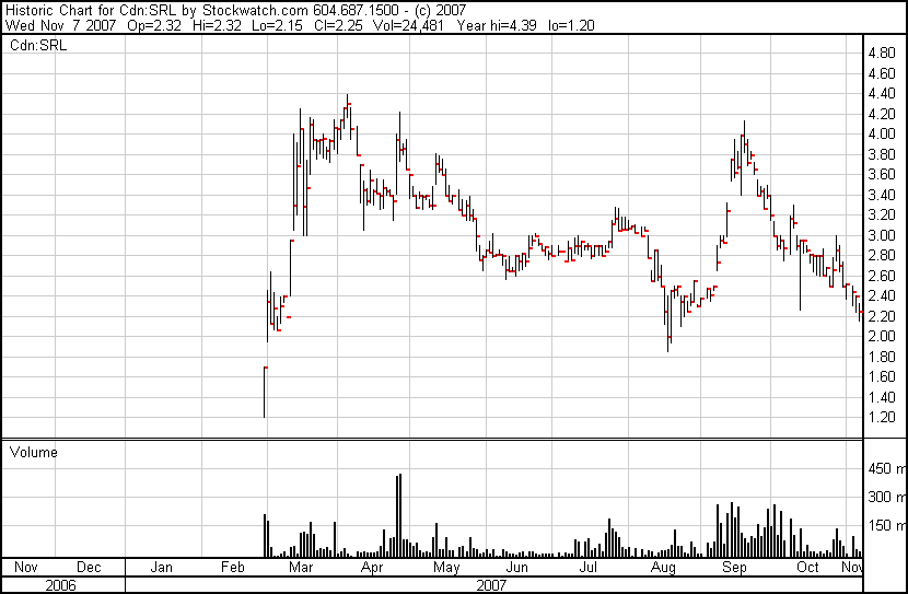 "With current prices of gold and silver and with positive outlook for the future of these metals, investment in SRL could lead to high rewards if the Company determines that its projects contain recoverable ore reserves."