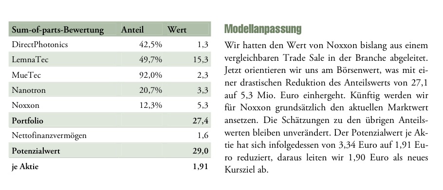 Wenn man sich den neuen bezahlten SMC-Research im Original ansieht, ist die Abwertung für den NOXXON Anteil zwar drastisch (erwartete 27,1 Millionen auf tatsächliche 5,3 Millionen Euro), aber für die DEWB kommt man immer noch auf einen Potentialwert von aktuell 1,91€ pro Aktie oder halt jene 1,90 € als Kursziel. Diese sollte sich jetzt dynamisch mit dem Noxxon Kurs nach oben in Richtung der alten Schätzung von 3,34€ bewegen oder bei Komplettabschreibung der Noxxon-Beteiligung auf mindestens 1,55€ belaufen.