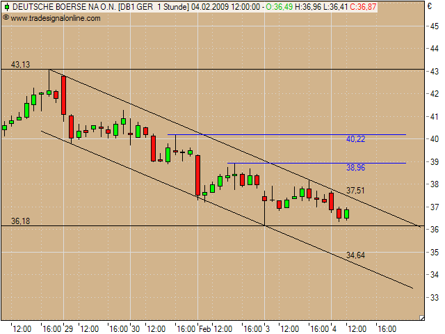Die Deutsche Börse Aktie bewegt sich in einem langfristigen intakten Abwärtstrendkanal, sodass der Chartverlauf zur Zeit folglich wenig aussichtsreich erscheint. Aufgrund des ausgeprägten Abwärtstrends entsteht grundsätzlich erst nach Abschluss einer umfassenden Bodenbildung eine Trend- und somit eine Stimmungsänderung. Bis zum jetzigen Zeitpunkt ist allerdings selbst der Ansatz dieser notwendigen Bodenbildung noch nicht zu erkennen. Aufgrund der zur Zeit schlechten Kursentwicklung verbunden mit der Möglichkeit einer weiteren Abwärtsbewegung ist die Deutsche Börse Aktie daher lediglich eine Verkaufsposition.