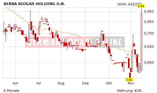 52-Wochen Tief: 0,42 Euro Die BEBRA Biogas Gruppe mit Sitz in Hamburg hat einen Auftrag in zweistelliger Millionenhöhe zum Bau einer Biogasanlage mit einer Leistung von drei Megawatt (MW) erhalten. Die Verträge wurden heute auf der Messe Agritechnica unterzeichnet. Der Baubeginn der Großanlage wurde auf das zweite Quartal 2012 fixiert.