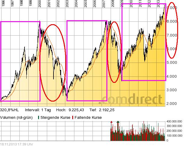 Die DAX-Umsätze an der Xetra-Börse sind immer noch absolut niedrig. Vom billigen Geld, welches in die Aktienmärkte gepumpt wird, gibt es noch nichts zu sehen. Am Markt fehlen also zahlenmäßig entweder die Käufer oder die Verkäufer. Da wir stetig steigende Kurse sehen, würde ich daraus schließen, dass die Verkäufer am Markt fehlen und Käufer nur ungern bei steigenden Kursen kaufen. Warum fehlen die Verkäufer? Ich denke hier, dass viele Aktien warm und kuschelig in langfristigen Depots liegen. Und die Verkäufer sehen noch keine Euphorie, die von allen Marktteilnehmern ja fast herbeigesehnt wird. Ein Crash kommt aber nie, wenn alle damit rechnen. Ich bleibe daher weiterhin long eingestellt. Muss aber immer erwähnen, dass ich eine Konsolidierung auf z.B. 8.500 Punkte nie ausschließen kann, diese aber auch einfach aussitzen würde. Mit dieser einfachen Strategie bin ich seit einem DAX von 5.500 Punkten voll investiert, bei fast keinen Ordergebühren. Natürlich wäre ich 2012 gerne bei 7.000 Punkten ausgestiegen und bei 6.000 Punkten wieder eingestiegen. Aber ich bezweifel, dass viele Aktionäre dieses Kunststück hinbekommen haben. www.kostolany-analyse.de |