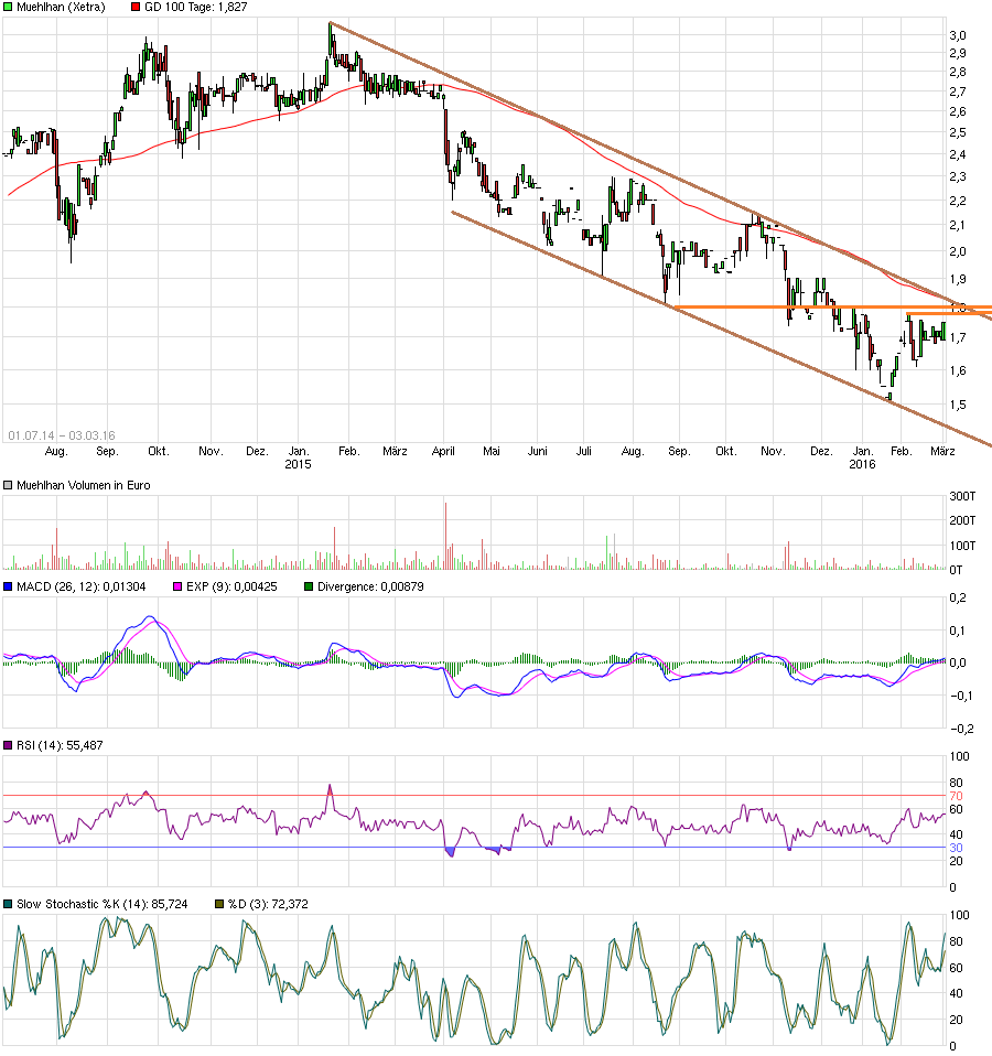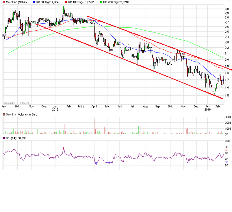 schon erstaunlich, wie gut bei so einem extrem illiquiden SmallCap wie Muehlhan hier ausnahmsweise die Trends und Widerstände/UNterstützungen zu zeichnen sind.