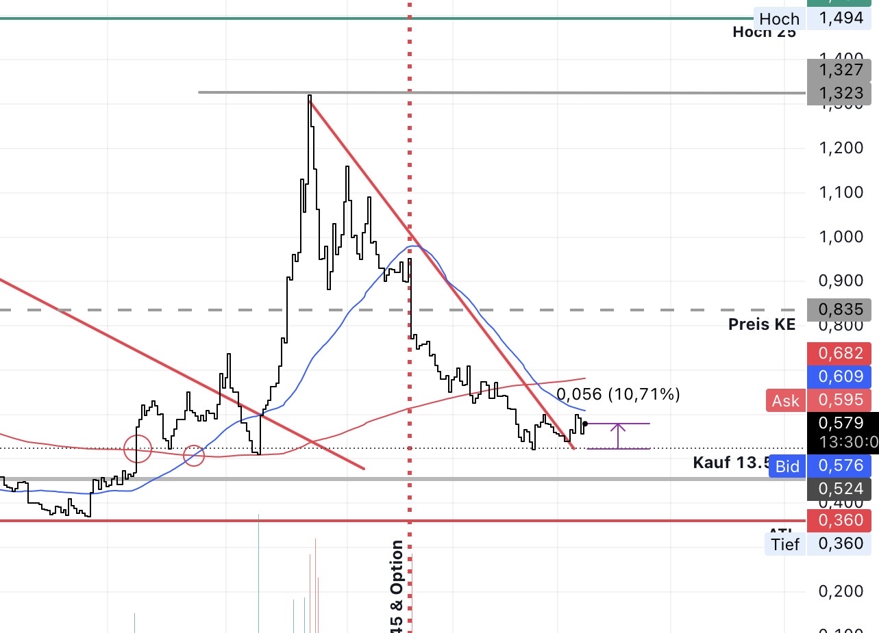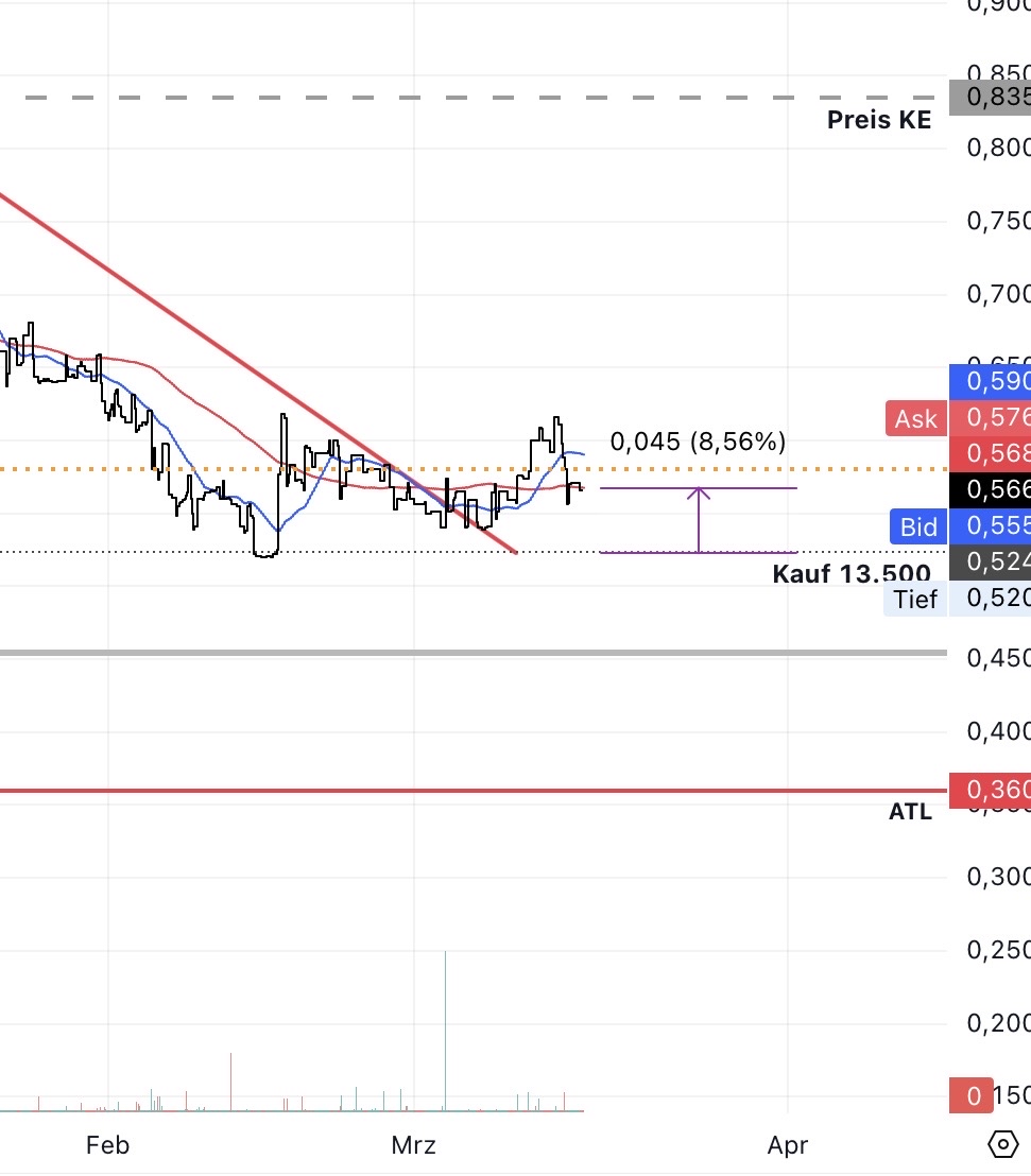 Wir stehen nicht kurz vor, sondern kurz nach dem Tiefpunkt der Aktie. Ich hab super eingekauft, allerdings nicht zu  0,45 Cent (das wäre arg billig), sondern zu 0,524 CAD, das war aber tatsächlich recht günstig. Klar bin ich nur mit kleinen Beträgen im Plus, da wohl niemand bei einem solchen start-up all in geht. Ich habe aber in der Vergangenheit mit Nano One immer gute Erfahrungen gemacht, weil ich entdeckt habe, dass die Aktie sich stets folgsam an die von mir eingezeichneten Chartmuster hält. Im übrigen bin ich bescheiden. Was ich als "gut im Plus" empfinde, mag für andere lächerlich sein.